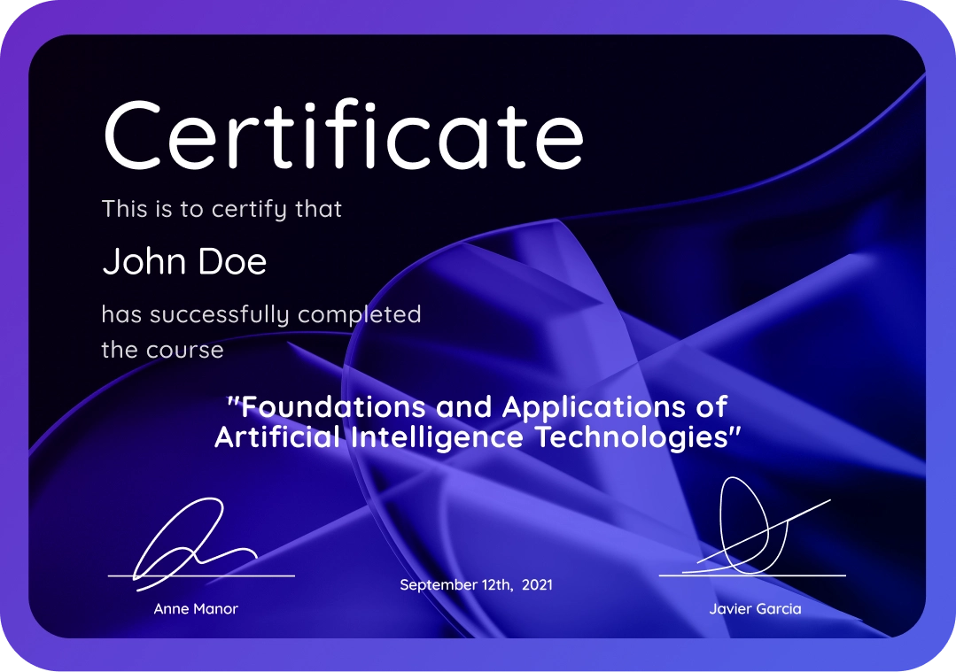 After completing the course and the final test, you will receive a certificate that will certify that you have acquired thorough knowledge and skills in the use of artificial intelligence in the automation of business processes.